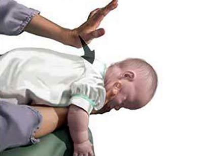 Phương pháp vỗ lưng được thực hiện với người sơ cứu ngồi hoặc đứng, chân đưa ra phía trước. Đặt trẻ nằm sấp dọc theo mặt trước cẳng tay của người sơ cứu trong tư thế cổ ngữa, đầu thấp. Người sơ cứu vỗ 5 lần vừa phải vào lưng của trẻ ở vị trí giữa hai xương bả vai.